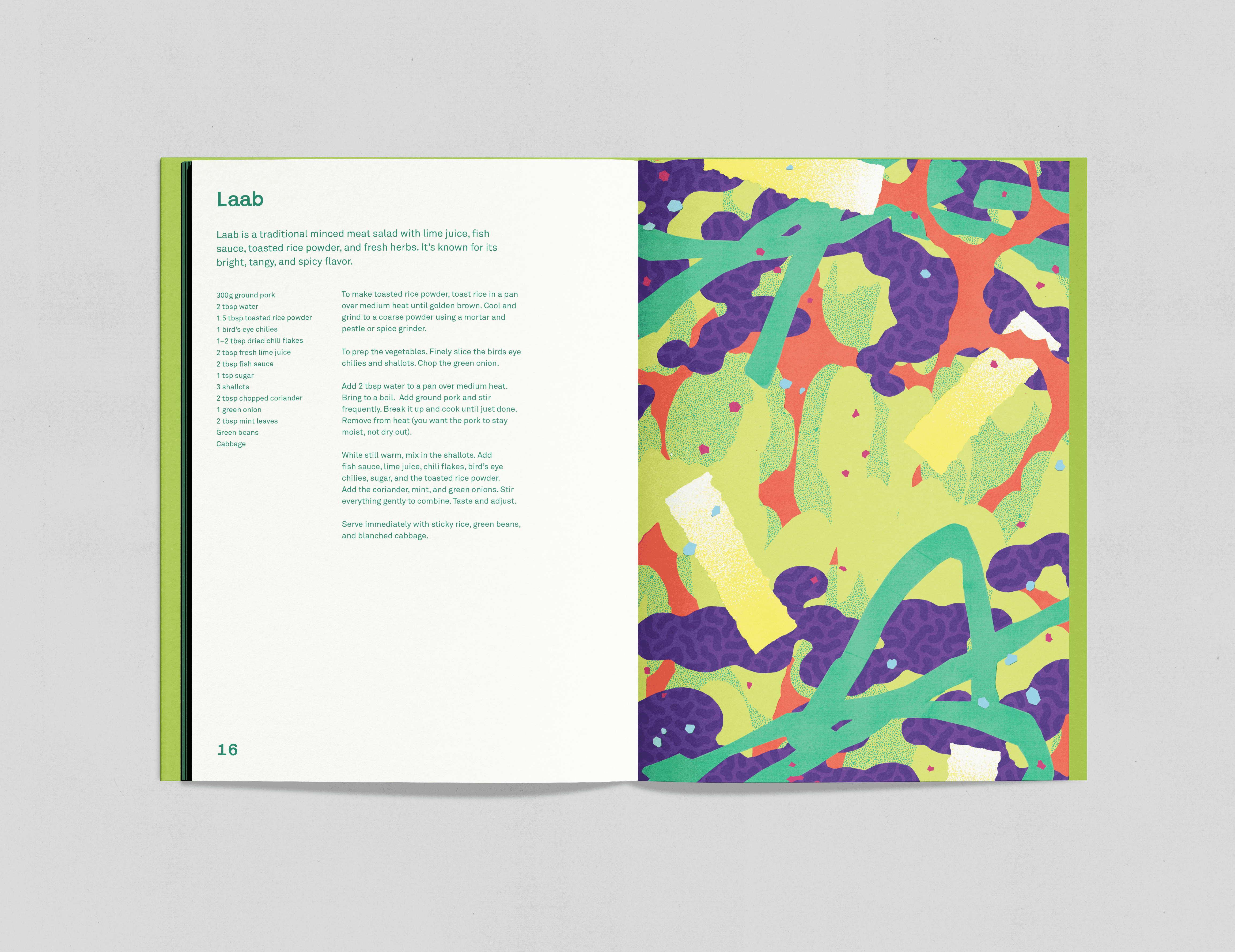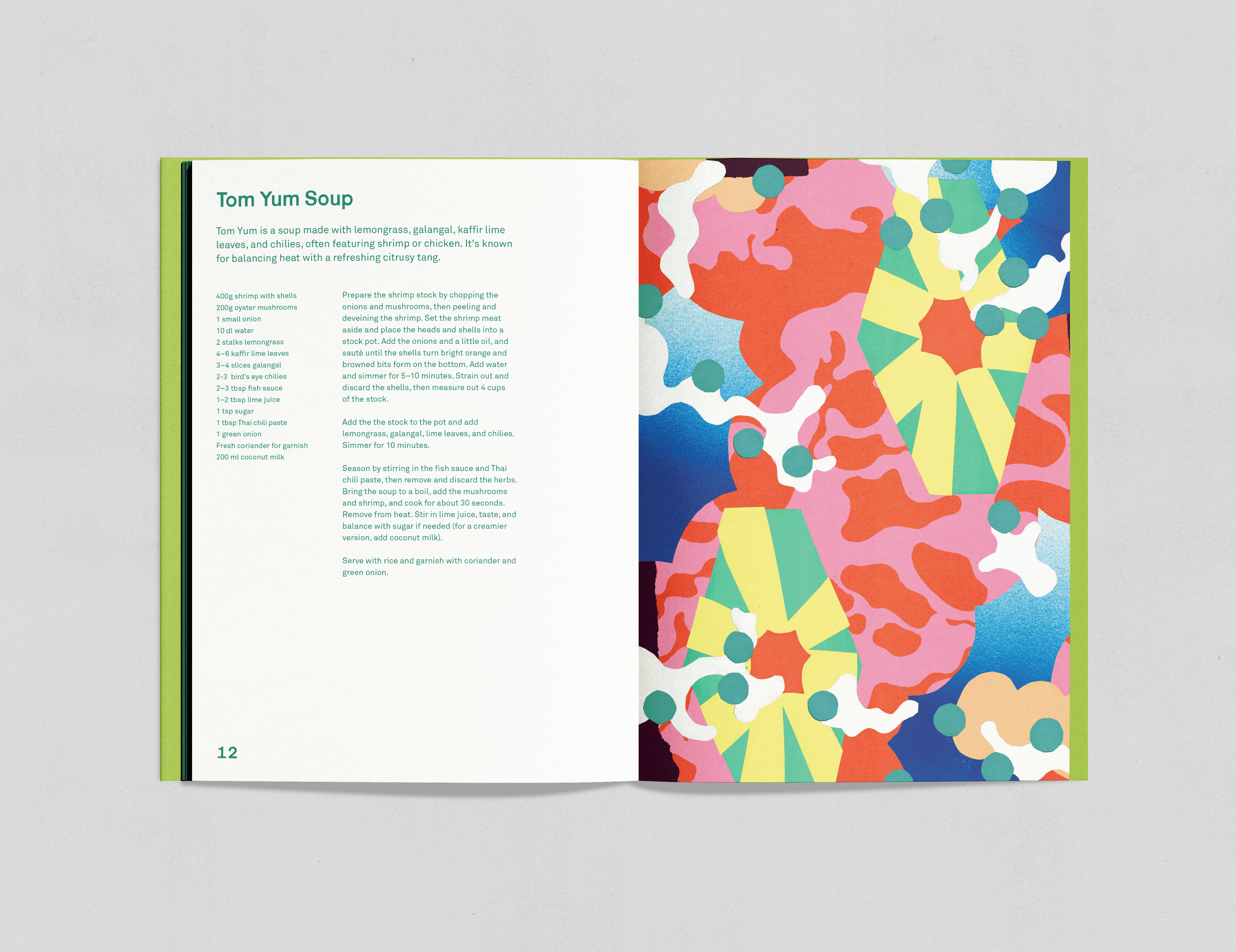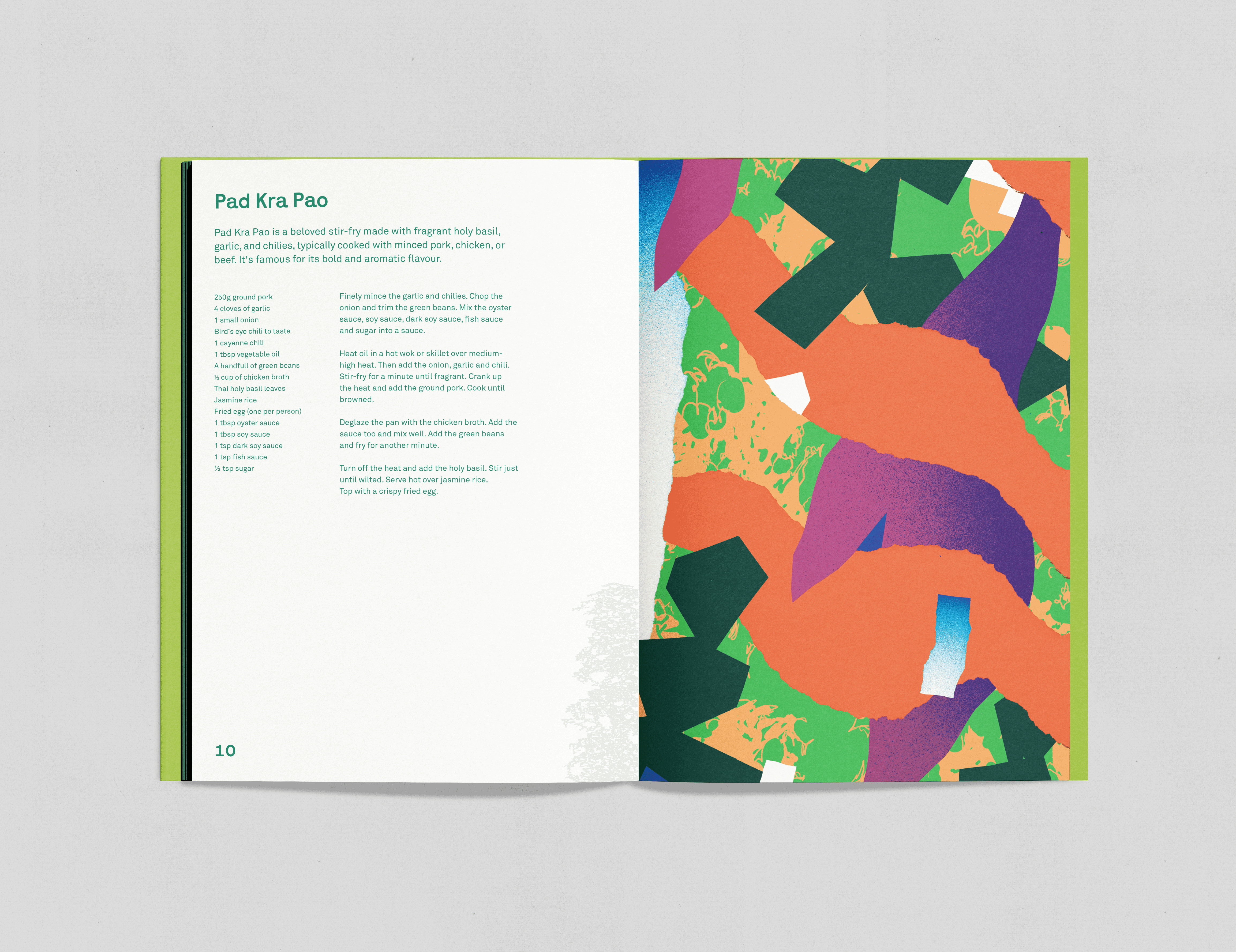 I prosjektet hadde jeg ansvar for designet og var med å forme den visuelle helheten. Vi valgte en grønn, frodig fargepalett inspirert av de friske smakene og vegetasjonen i Thailand, og en font med cut-out-preg som komplementerer collage-stilen i smaksillustrasjonene. Layouten er holdt enkel for å gi illustrasjonene hovedfokus.