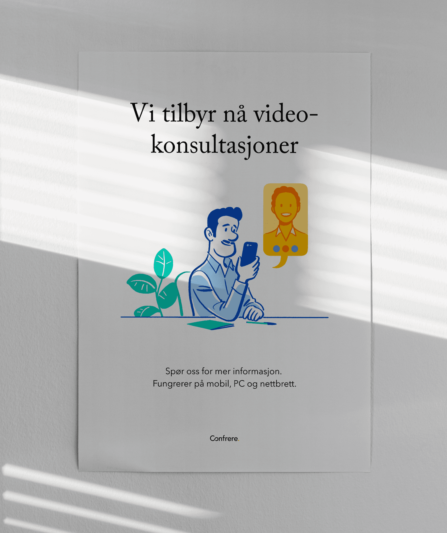 Et annet aspekt var å hjelpe legene med å informere pasientene om muligheten for videokonsultasjoner. Til dette formålet laget vi plakater, flyers og innlegg til sosiale medier som kunne brukes på og av legekontoret.